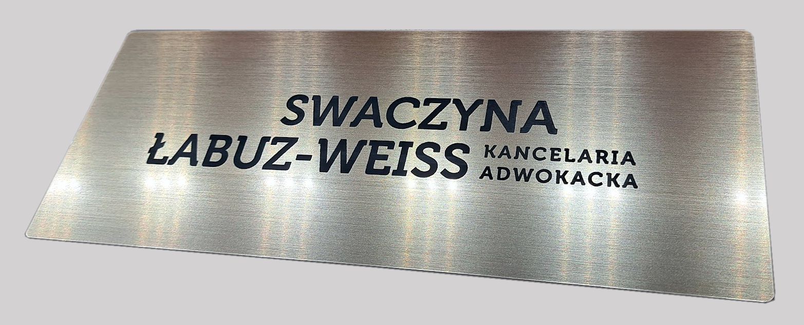 - Tablice grawerowane w laminatach grawerskich: to alternatywa dla bardzo kosztownych tablic i szyldów grawerowanych z mosiądzu czy stali nierdzewnej. Szeroka gama materiałów z tworzywa sztucznego z metalizowanymi powłokami pozwala na wykonanie dowolnego szyldu lub tablicy technika grawerowaną. Dodatkowo usztywnione z powodzeniem można montować na zewnętrznych elewacjach. Tą metodą wykonujemy przede wszystkim tablice dla kancelarii adwokackich, szyldy radców prawnych, tablice kancelarii notarialnych, tabliczki na oznakowanie pomieszczeń biurowych czy eleganckie tabliczki imienne a nawet breloki do kluczy czy drobne elementy ozdobne a nawet same litery klejone bezpośrednio na ściany.